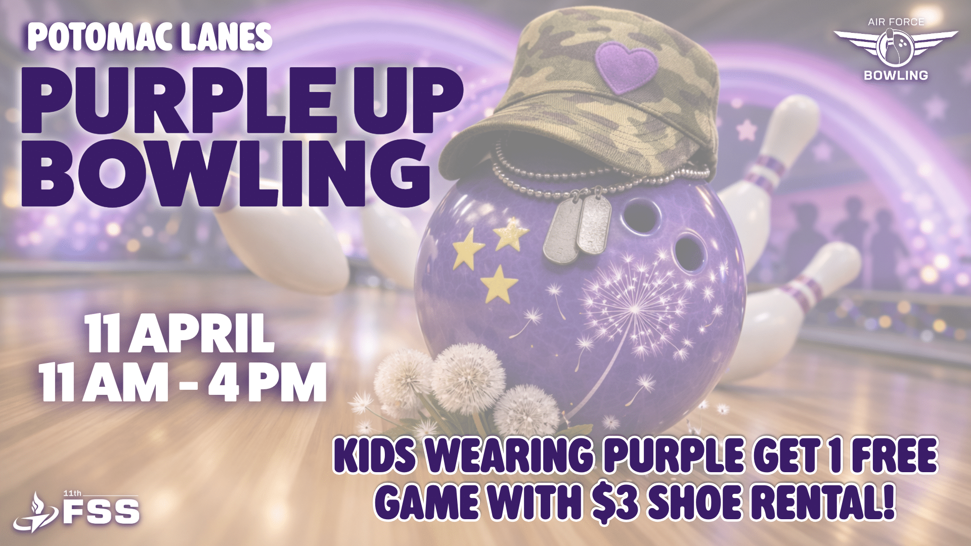 Join us at Potomac Lanes for Purple Up Bowling as we celebrate and support our military children! Kids who wear purple will receive one free game with a $3 shoe rental. Bring the family out for a fun-filled day of bowling, community, and appreciation—don’t miss this special event honoring our youngest heroes!