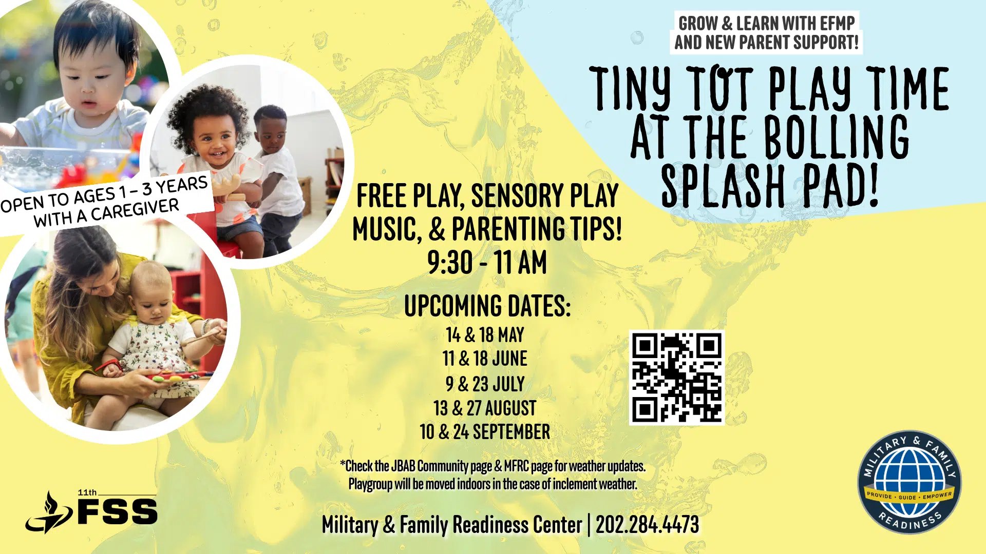 Tiny Tot Play Time May 14, 2025 @ 9:30 am - 11:00 am Grow and Learn with JBAB EFMP at Tiny Tot Play Time at the Bolling Splash Pad!