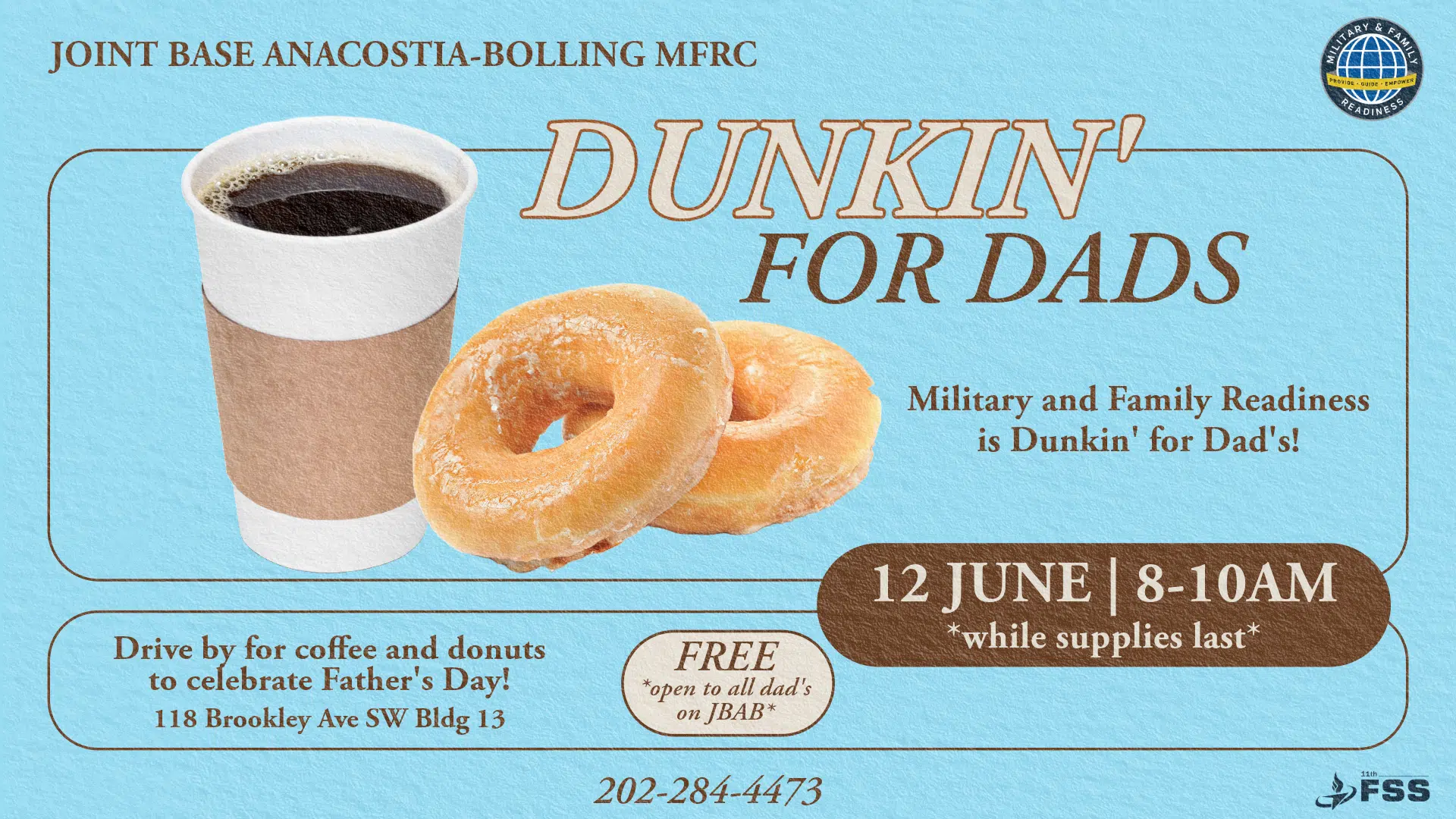 Military and Family Readiness is Dunkin' for Dad's! Drive by for coffee and donuts to celebrate Father's Day!