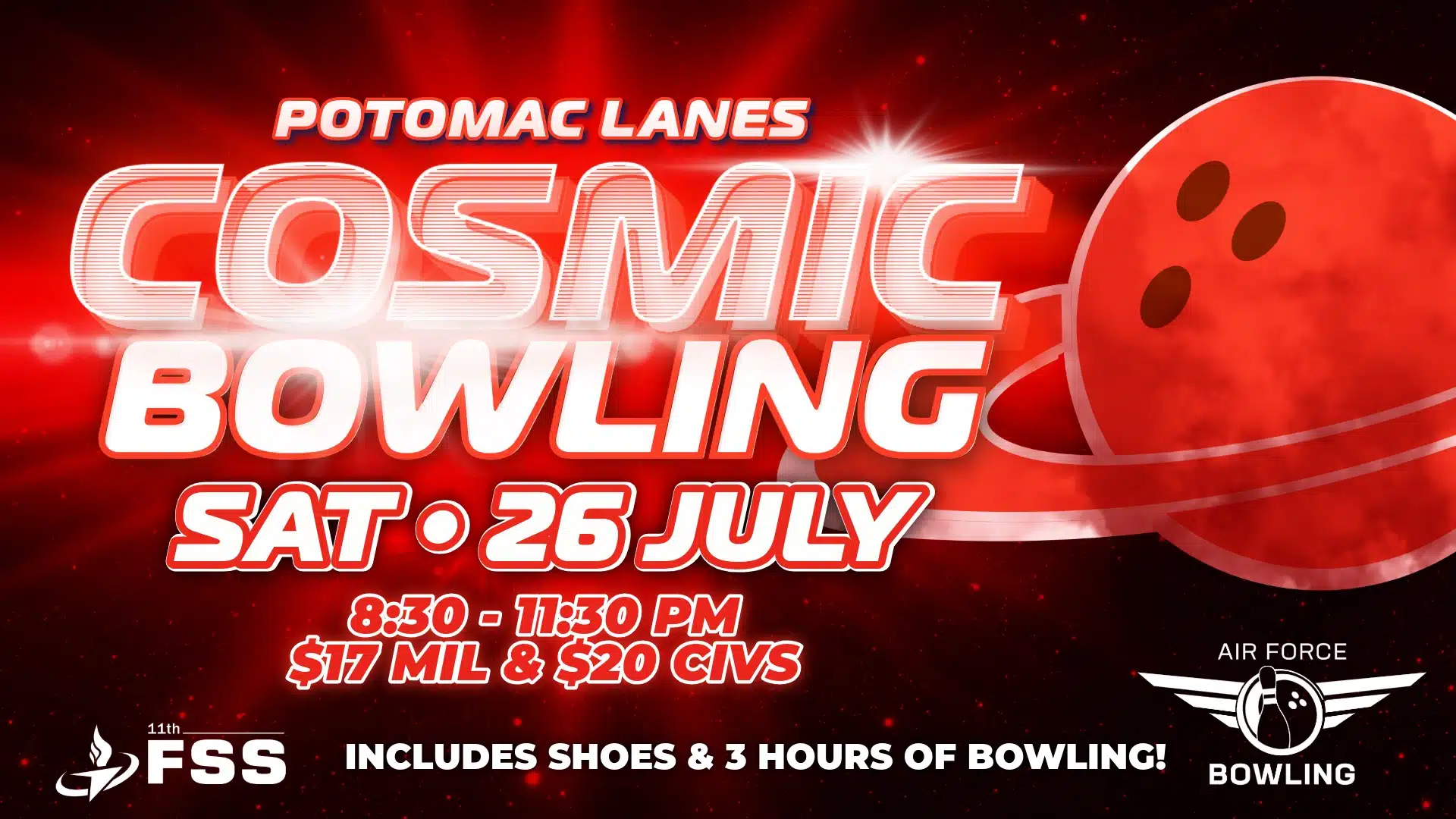 Glow big or go home! Join us for Cosmic Bowling at Potomac Lanes on Saturday, July 26th! Get 3 hours of bowling, including shoes, from 8:30-11:30 PM. Don't miss the fun!